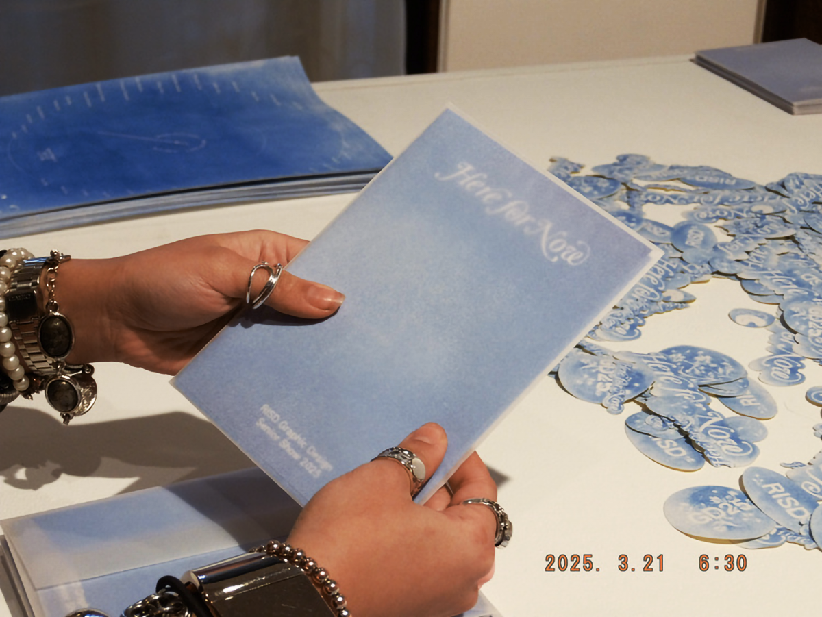 Here for Now captures the ephemeral nature of the curatorial direction through the motif of cyanotype and analog textures, carried across cyanotyped bookmarks, risograph-printed catalogs, and hand-delivered invitations.